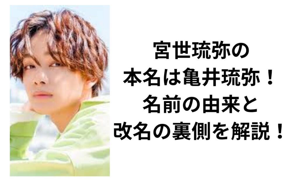 人気俳優の宮世琉弥(みやせ りゅうび)さんは、ドラマや映画での存在感と端正なルックスで多くのファンを魅了しています。 今回は、宮世琉弥さんの名前にまつわる由来、そして芸名へと変わった背景を詳しく解説します。 宮世琉弥の本名は亀井琉弥! 出典... -
