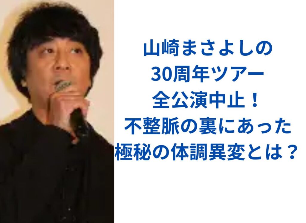 山崎まさよしの30周年ツアー全公演中止!不整脈の裏にあった極秘の体調異変とは?シンガーソングライターの山崎まさよしさん(52)が、来月から予定していたデビュー30周年記念ツアーの全公演を中止することを発表しました。 理由は「不整脈の症状で長時間のライブ演奏が困難と判断したため」とされています。 しかし、音楽業界関係者に...