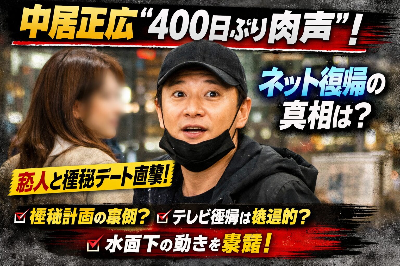 中居正広さんが恋人女性とのデート中に直撃取材を受け、約400日ぶりに肉声を発しました。