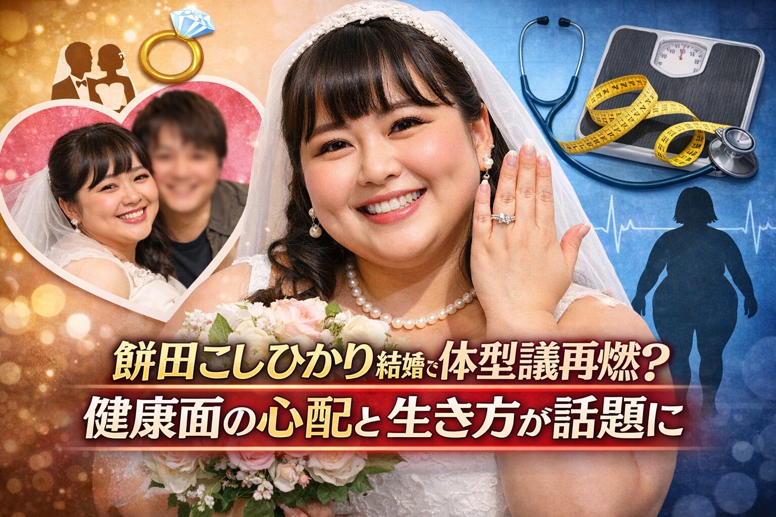 餅田こしひかりさんが結婚を発表し祝福の声が広がる一方で、体型や健康についての議論も再燃しています。