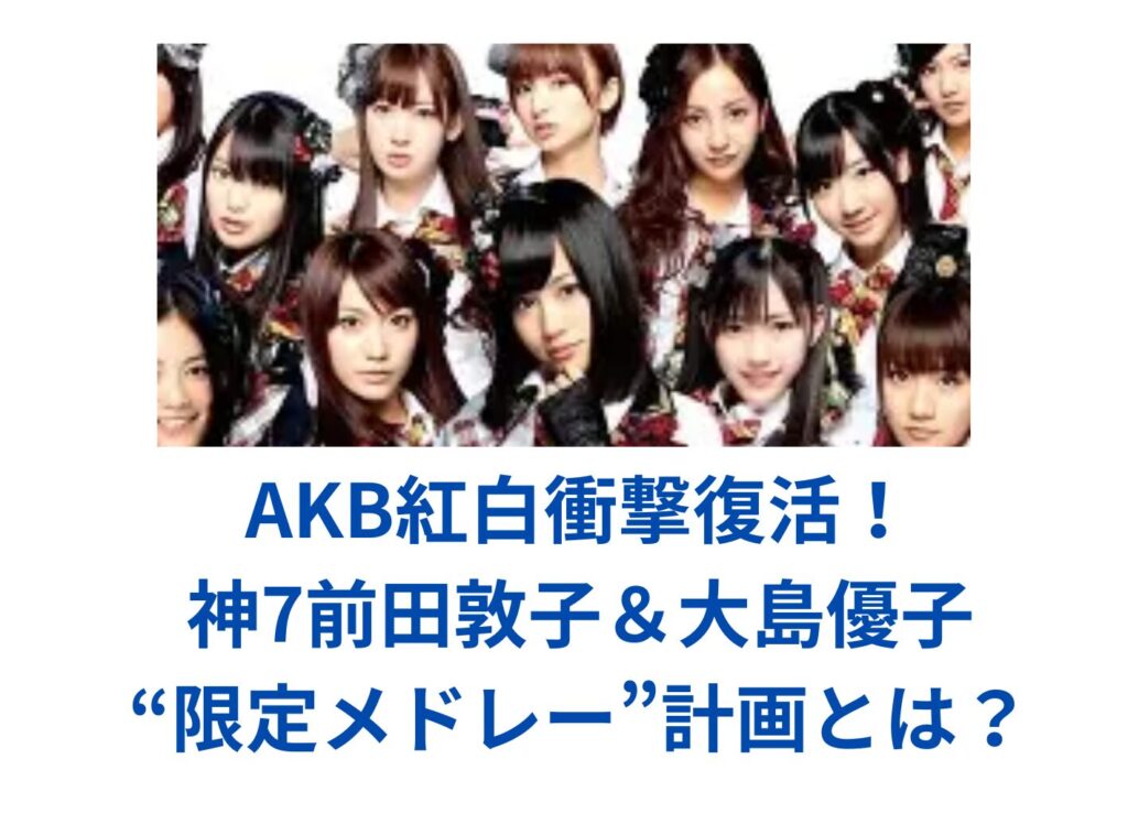 AKB48の“神7”前田敦子さんと大島優子さんが、年末の紅白歌合戦に限定復活することが内定した模様です。 ヘビーローテーションなど黄金期の名曲をメドレーで披露する予定で、ファン待望の一夜限りステージが実現します。 AKB紅白衝撃復活! この投稿をInsta... -